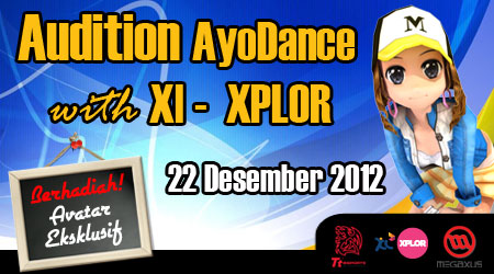 Akan ada Event seru nih di akhir bulan Desember ini karena di tanggal 22 Desember 2012. Audition AyoDance bekerjasama dengan XL - Xplore akan mengadakan Tournament game online AyoDance yang seru dan menarik. karena di sini kalian dapat mengikuti fun games-fun games seru yang berhadiah Avatar dan hadiah menarik pastinya. Yang pastinya rugi buat dilewatkan, kita tunggu ya kedatangan kalian semua di Event kali ini. Be There ^^