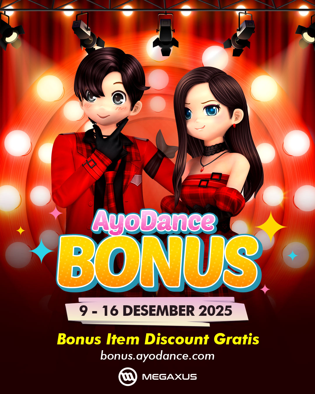 Hi Semuanya! Tim AyoDance punya kabar baik! Di awal patch ini, kami akan memberikan bonus discount coupon buat kalian semua! Dengan membeli atau gift avatar, kamu bisa mendapatkan berbagai bonus menarik dari tim AyoDance! Langsung cek bonus bar dan klaim hadiahnya di https://bonus.ayodance.com