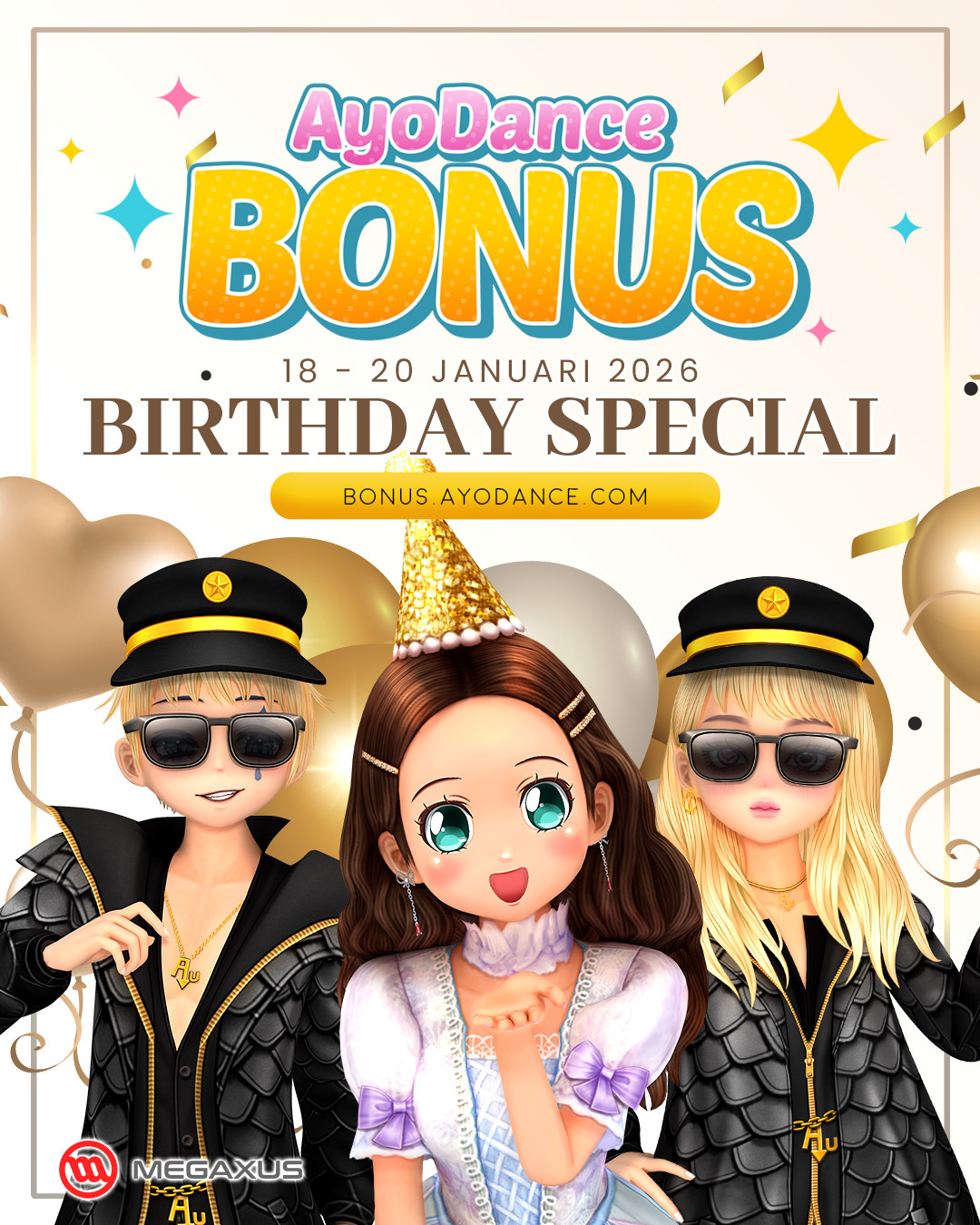 Tim AyoDance akan memberikan bonus avatar permanent GRATIS! di ulang tahun AyoDance tahun ini. Cukup dengan membeli atau gift avatar selama periode event, kamu bisa dapatkan berbagai bonus menarik dari tim AyoDance! Langsung aja cek bonus bar dan klaim hadiahnya di https://bonus.ayodance.com (✧ω✧)