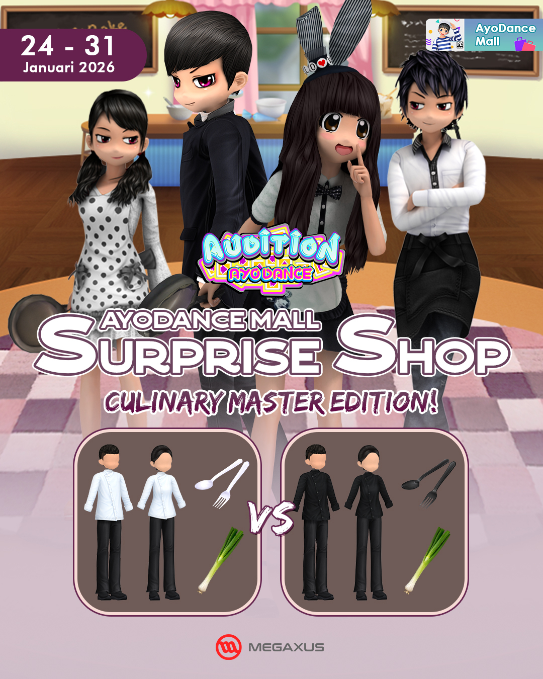 Ada yang baru di AyoDance Mall! Dapatkan Culinary Master Avatar yang bikin kamu tampil jadi Chef Profesional, dengan durasi permanent dan harga spesial. Avatar ini akan tersedia pada tanggal 24 Januari hingga 31 Januari 2026. ⸜(*ˊᗜˋ*)⸝